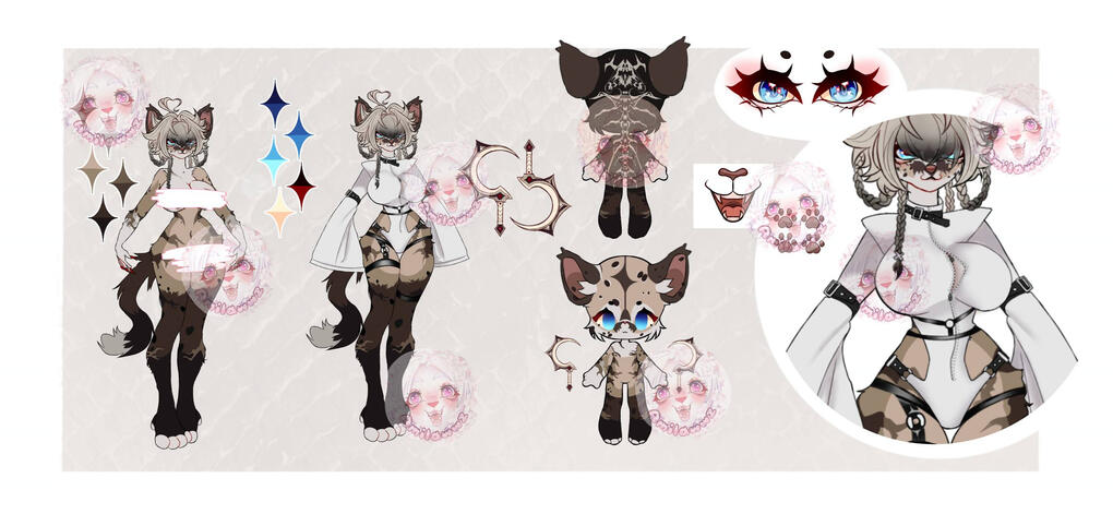 Option 4: Frontal reference (full body flat color + colored eyes + paws + mouth + headshot + color palette) + shiny eyes icon + outfit of choice + half body full color + full body full color with background of choice: $180 usd
